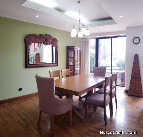 El apartamento amueblado tiene 3 dormitorios, 2.5 baños, balcón, recibidor, Sala, Comedor, Cocina independiente, area de lavanderia, dormitorio de servicio con baño completo, 2 estacionamientos, pisos de madera, electrodomésticos en cocina y lavanderia, calentador de agua, cortinas.