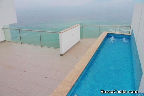 Consta de- sala comedor, comedor de diario, cocina, lavandería, sala de estar , 3 dormitorios, el principal con walk-in closet cada baño tiene su baño incorporado, baño de visitas, cuarto y baño de servicio, 3 cocheras tipo paralelas, 2 ascensores, terraza amplia, permiten mascota, con linda vista al mar. Areas comunes- piscina área de BBQ.