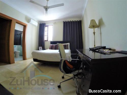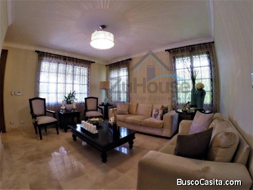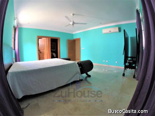 Amplia Habitación principal con vestidor (Adicional un Closet) y amplio Baño (Ducha y Jacuzzi), 3 Habitaciones Secundarias grandes, cada una con su vestidor (Forrado en madera preciosa) y su Baño Privado, 3 espaciosas Salas de Estar, Amplio Comedor, Cocina grande, Área de Lavado, Cuarto de Servicio, Amplia Terraza, Patio, 1/2 Baño de Visita, Estudio u Oficina (Diseñado Estructuralmente para Gimnasio) y Cuarto para guardar cosas, 3 Parqueos Techados y 3 Parqueos Libres.