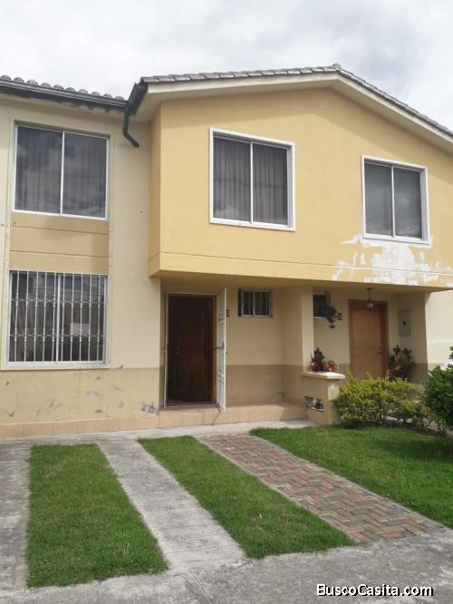 Teléfonos de contacto: 0992536309/0979169317 Casa de dos pisos ubicada en el conjunto Privado Casa Club Los Pinos en el Valle de los Chillos (Sangolquí), la casa cuenta con 3 habitaciones una de ellas es máster. Las habitaciones son alfombradas y tienen clóset. La habitación máster cuenta con baño privado. Las otras dos habitaciones con bañocompartido. En el primer piso se encuentra la sala comedor, cocina estilo americano amoblada y con alacena, y un baño social, en la parte posterior existe un patio y la lavandería.Cuenta con línea telefónica. En la parte frontal es el jardín y el estacionamiento. El conjunto cuenta con guardianía las 24 horas, piscina, área bbq, canchas deportivas, área de juegos infantiles, estacionamientos y salón para eventos. La casa está ubicada frente a las canchas deportivas y a la piscina.