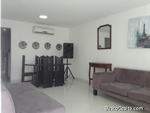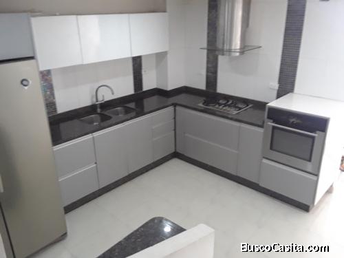 Townhouse de tres niveles, iluminado y ventilado, de agradable altura, totalmente remodelado y actualizado con materiales de primera calidad, consta de área social con aire acondicionado para mayor frescura, que incluye sala y comedor, le sigue una amplia cocina empotrada en gris claro, tope de granito oscuro, estufa a gas, horno eléctrico 110v, campana, también encontramos espacio con los respectivos puntos para culminar un medio baño, actualmente se ubica allí el tanque de agua con su bomba.