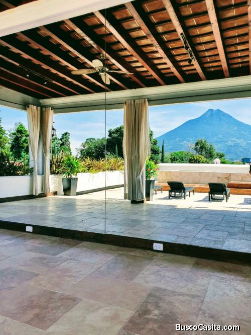 cuenta con piscina, pergola, bar, 6 habitaciones con sala, comedor, cocina de alto perfil, ubicada en centro de Antigua en área caminable al parque central, pero en lugar callado y exclusivo. aproveche!
