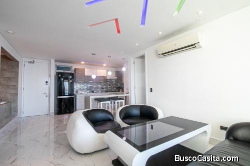 Exclusivo apartamento con vista al mar, ubicado en piso alto, con excelente vista panorámica del mar y de la ciudad de Cartagena, totalmente remodelado con mosaicos importados, amoblado con muebles importados y de última tecnología en cuero italiano, con lineales de luces en techo y pared, las camas tiene incorporados un masajeadores el cual se manejan con un control para graduar la intensidad y la zona del masaje también son fabricadas en cuero italiano.
