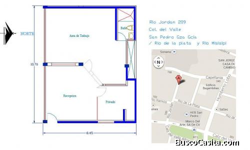RENTO OFICINA EXCELENTE UBICACIÓN RIO JORDAN 209, COLONIA DEL VALLE. OFICINA A PIE DE CALLE. EDIFICIO DE LOCALES COMERCIALES Y DEPARTAMENTOS: AREA 90 M2, CUENTA CON 2 PRIVADOS, AREA RECEPCION, UN BAÑO COMPLETO, 3 MINI SPLITS. SERVICIOS APARTE: LUZ Y AGUA PAGA CUOTA DE ACUERDO AL CONSUMO.