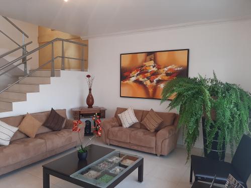 Planta baja: Sala principal, comedor, cocina, área de máquinas, medio baño social, bodega, área de servicio con bañó privado, pequeño jardín y 2 estacionamientos abiertos.