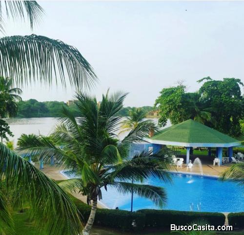 Vendo decorado apartamento, totalmente equipado. 2 habitaciones, 2 baño , sala - comedor y cocina son espaciosos. El inmueble tiene conexión doble de DIRECTV en todas sus instalaciones y dos equipos centrales de aire acondicionado separados, uno para las habitaciones y otro para la sala, comedor y cocina. Adicionalmente tiene una amplia terraza con mesa, sillas y el conjunto residencial ofrece jardines, caminarías, piscina para niños y adultos, canchas de tenis y frontón, parrilleras, embarcadero para lanchas y motos, puesto de estacionamiento para visitantes, vigilancia privada las 24 horas, posee un modulo policías enfrente de las residencias.